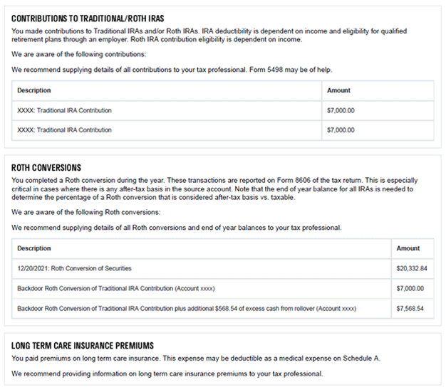 Every January, we send our top clients “Tax Preparation Letters” that summarize transactions from the prior tax year. This includes, but is not limited to, Roth conversions, IRA contributions, and taxable gains and losses. We use Holistiplan to assist us with the composition of these letters. See below for an example of what the letter looks like.