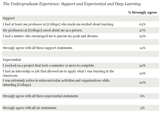 Using my daughter as an example, I wrote a piece on my own blog when Gallup-Purdue originally released its findings. Caitlin would have been one of the three percenters. A former marketing director for a toy company, Caitlin launched a start-up (Maxable) in early 2018, moved to the Silicon Valley, and is happy in her career and her personal life.