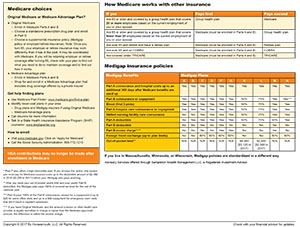 It has Medicare information on the front and Affordable Care Act details on the back. Each side includes critical information about which programs apply to which people; when to apply, information about premiums and deductibles, and references to other resources with more information.