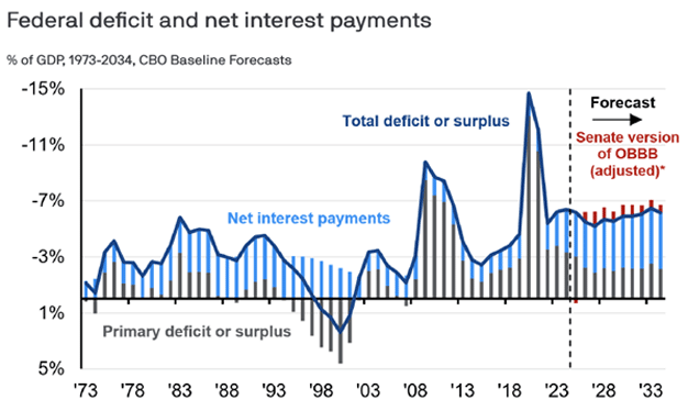 This chart from J.P. Morgan Asset Management shows the federal deficit and net interest payments as a share of GDP from 1973–2034. It highlights how the OBBBA adjustments push total deficits higher and interest costs upward, with annual deficits projected to stay above 6% of GDP after 2028.